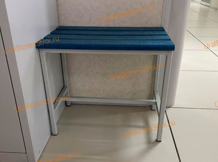 * Верхний настил сиденья выполнен из пластика(полимерный профиль) ,синего либо серого цвета. *Каркас скамьи сварной и выполнен из профильной трубы.