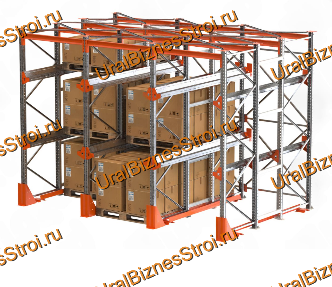 - Drive-through — конструкции с возможностью заезда с двух сторон, что позволяет работать по системе FIFO (первый пришёл — первый ушёл). Такой вариант удобен для хранения однотипного товара с ограниченным сроком годности.