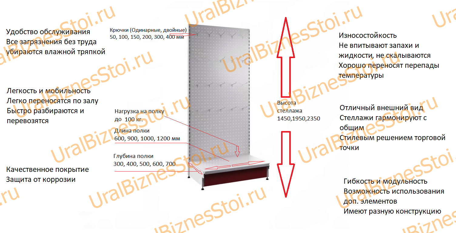 На панели может устанавливаться несколько полок различной глубины, световой короб для привлечения максимального внимания покупателей к продукции на полках и крючках. У нас можно купить стеллажи с полками с боковыми ограничителями, фронтальными держателями ценников. Внизу конструкции монтируются декоративные панели. Универсальная перфорация подходит для навешивания держателей и крючков любых видов.